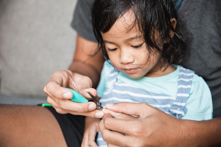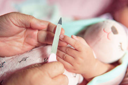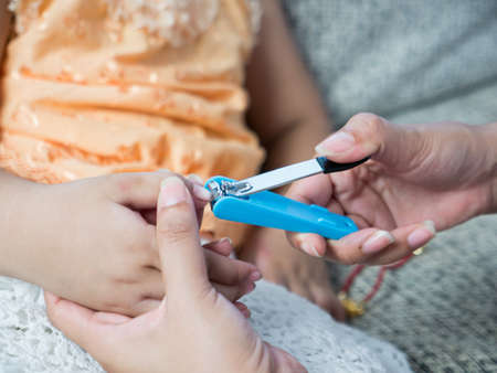 Mother cut nails of baby girl on fingers. pedicure. motherhood. care. scissors. fam
