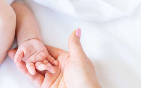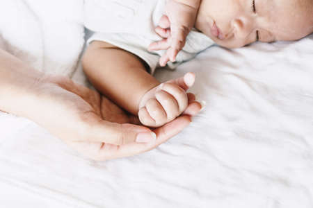 Mother uses her hand to hold her babys tiny hand to make him feeling her love, warm and secure.