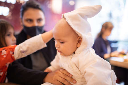 Baby sitting on a table while her older sister helps her by taking off her hood