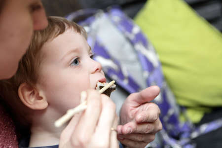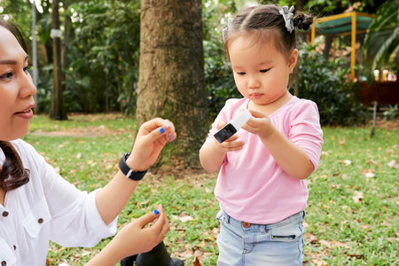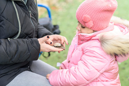 Mom has captured a small snail and little girl examines it very carefully in hand.