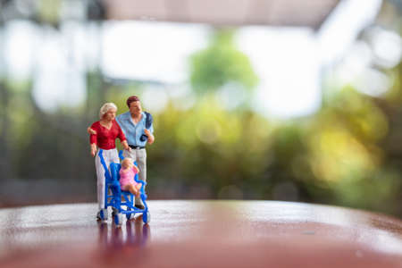 Miniature people : Disabled man sitting in wheelchair on on wooden background