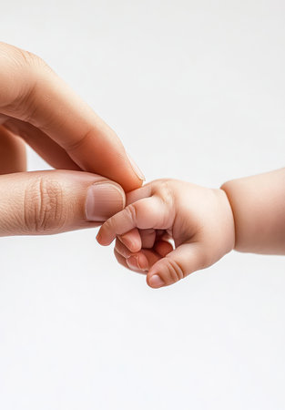 A close-up image capturing the tender moment of a mother's hand gently holding her baby's finger, symbolizing love and connection in a minimalist setting.