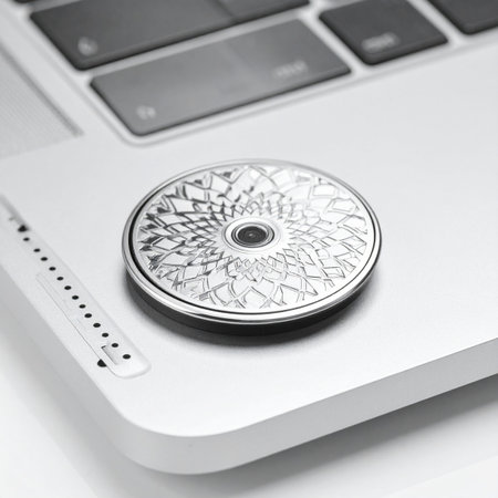 In a minimalist, modern workspace, a sleek silver smart tracker rests on a laptop, its intricate design hinting at the complex technology within.