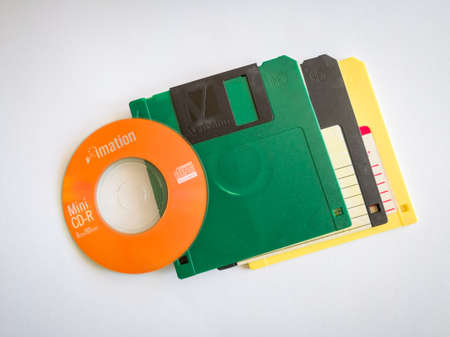 Mini CDs stacked on floppy disks, objects isolated on a white background, the evolution of technology.