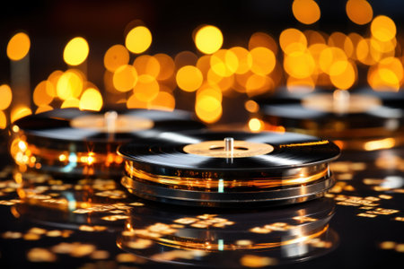 vinyl record, film reel, audio cassette, floppy disks and hard disks, various types of media from the last century on a yellow background, retro media