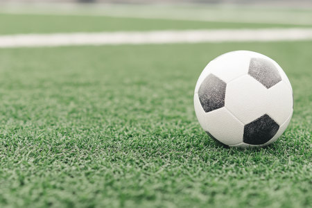 A classic black and white soccer ball lies on artificial grass at soccer field. Sports and healthy lifestyle concept.