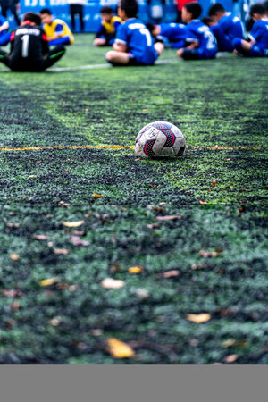 football and marker cones on green artificial turf with blurry soccer team training, blurry kid soccer player jogging between marker cones and control ball with soccer equipment in soccer academy.