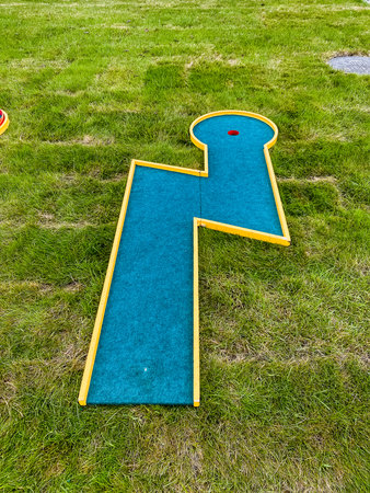 Mini golf course lane with obstacles and hole on bright green turf. Horizontal image with copy space ideal for banners advertising family leisure and sports content no people. Team building mini golf outdoor corporate activity
