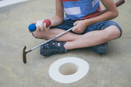 Happy little boy playing mini golf playing mini golf in a park at the day time. Kid having fun otdoors. Concept of good leisure.