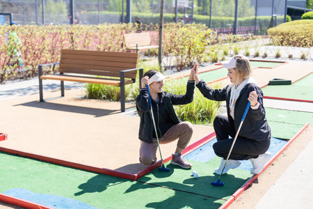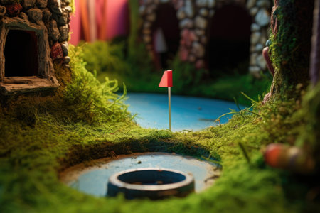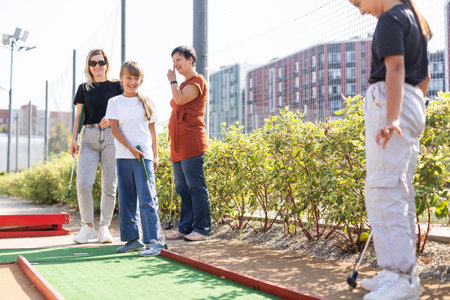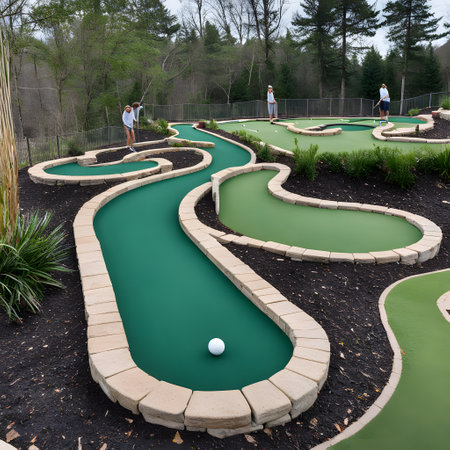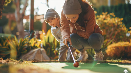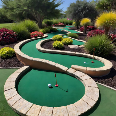 A group of friends enjoy a sunny summer day, engaging in a friendly competition on the miniature golf course Laughter fills the air as they navigate the whimsical obstacles, relishing the playful rivalry and relaxed atmosphere This outdoor activity offers a perfect blend of entertainment and camaraderie AI Generative