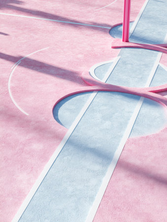 This colorful playground area showcases a pink and blue surface with circular patterns. The sunlight casts shadows, enhancing the vibrant design.