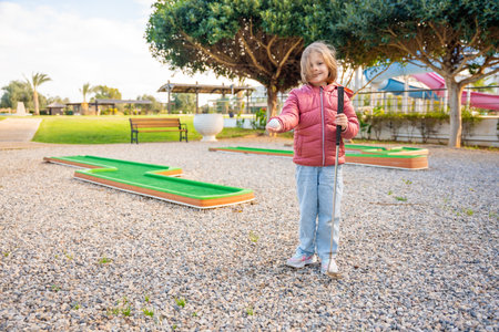 Cute preschool girl playing mini golf with family. Happy child having fun with outdoor activity. Summer sport for children and adults, outdoors. Family vacations or resort.
