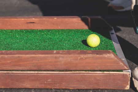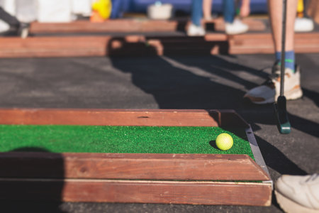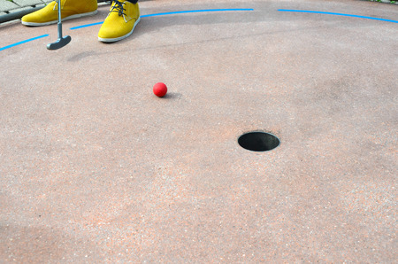 Mini golf - The player prepares to hit the ball with the club. Detail of the ball and the stick