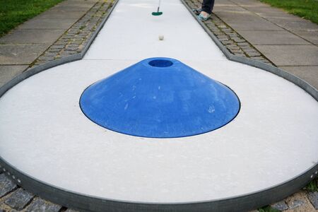mini golf club hits the ball into the hole on a track from concrete, copy space, selected focus