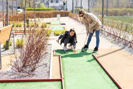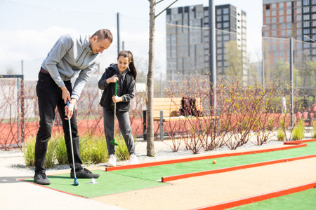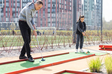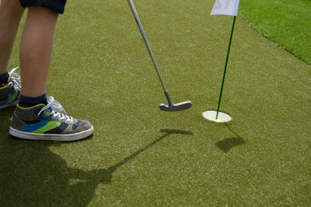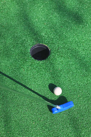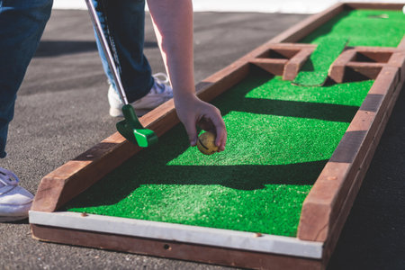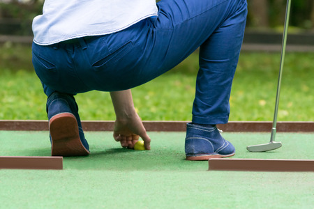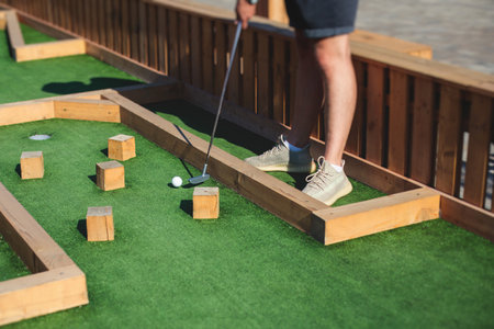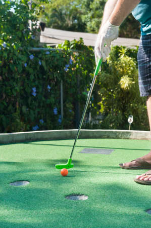 Golfer playing adventure or mini golf and trying putting ball into hole. Sports and leisure activities