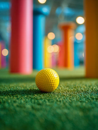 A bright yellow sphere rests on synthetic grass, surrounded by lively, multicolored pillars and shimmering light patterns that evoke a fun, energetic, indoor sports vibe.