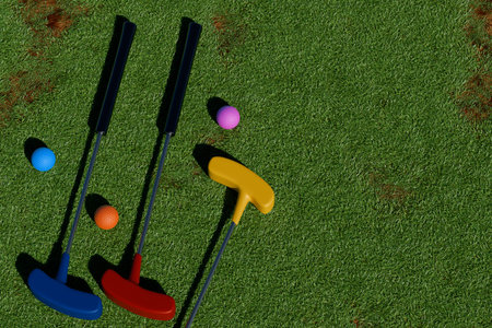 Colorful putters and balls on green grass, perfect for a fun day of minigolf. 3d rendering