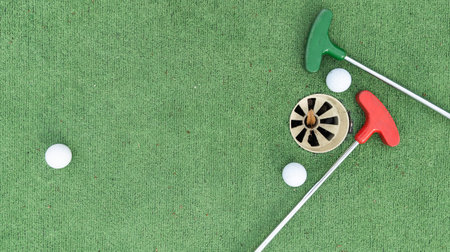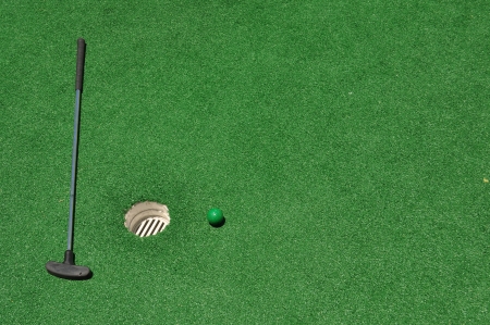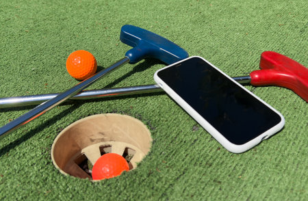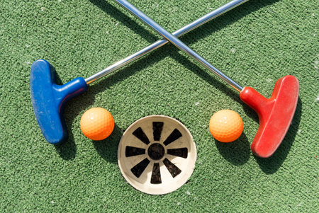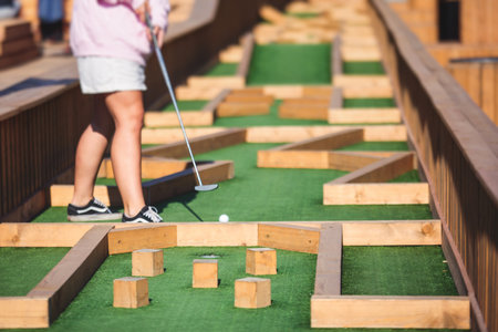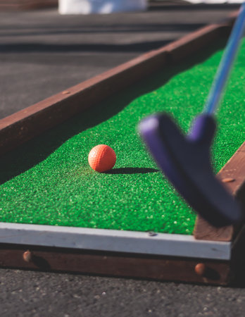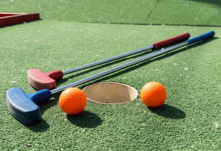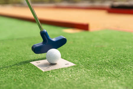 Mini golf course, process of playing miniature golf on a green artificial turf in a summer sunny day, equipment for mini-golf in a golf club resort, club and ball