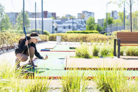 Woman playing miniature golf and trying to put ball into hole. Summer leisure activity