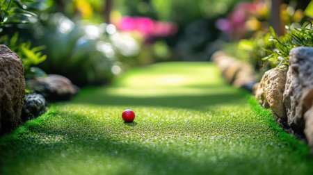 Close-up of red golf ball on mini-golf course surrounded by greenery