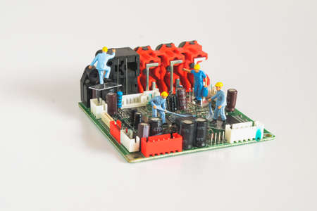 Worker figure on circuit board,service concept.