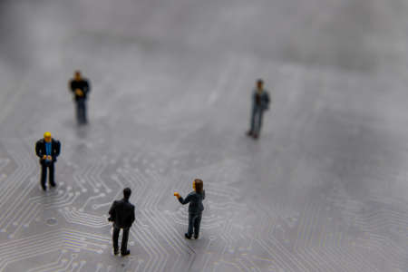Miniature figurines posed as business people in a meeting over abstract futuristic circuit board, future business concept
