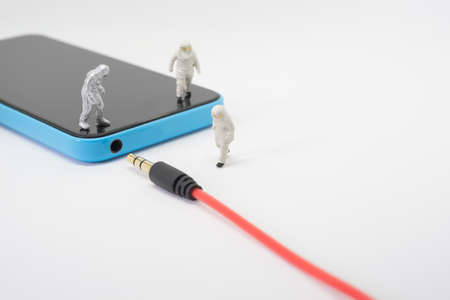 Earphone investigated team, Specialist looking on mobile phone or smartphone with removed audio cord.