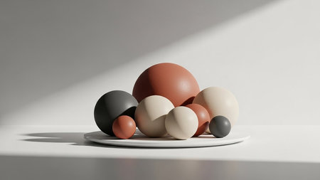 A collection of smooth, matte spheres in terracotta, beige, and grey tones arranged on a white plate.