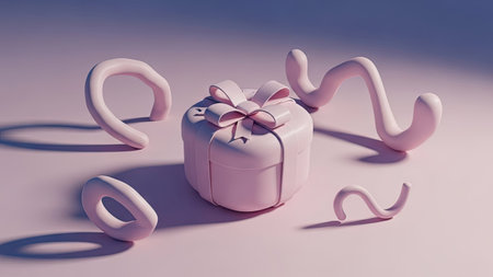 A pink gift box with a tied ribbon is the focal point, surrounded by abstract, curved forms. The scene is bathed in a soft, monochromatic pink palette. The composition features a diffused lighting style, suggesting a studio environment. This image is suitable for various commercial uses, including advertising and design.