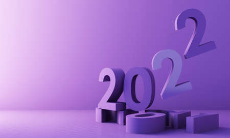 Letters of 2022 in the concept of New Year, purple pink trend color tones, surrounded by geometric shapes for displaying the products and gift boxes with transparent balls. 3d rendering
