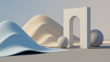 Abstract 3D rendering smooth organic waves and geometric shapes in soft pastel colors, creating a minimalist...