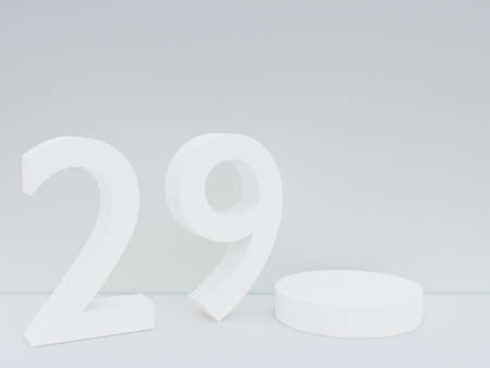Scene with podium for mock up presentation in white color, minimalism style and number 29 with copy space, 3d render abstract background design