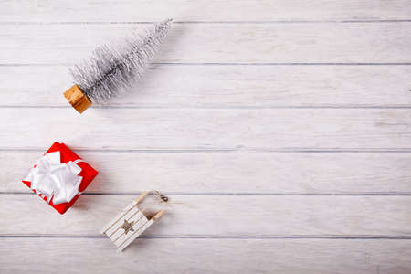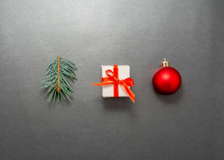 gift, red ball, christmas tree and pine cone top view. holiday objects on the table