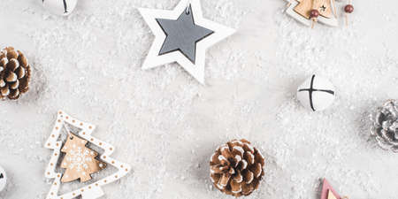 Festive Christmas background with Christmas decorations and snow. Flat lay, top view.