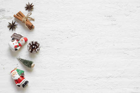 Christmas decoration toys and ornaments on rustic white wooden background. Flat lay Top view with copy space.