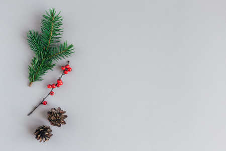Christmas background with spruce branches, red berries and pine cones. Holiday eco-friendly concept. Gray background. Flat lay. Place for text.