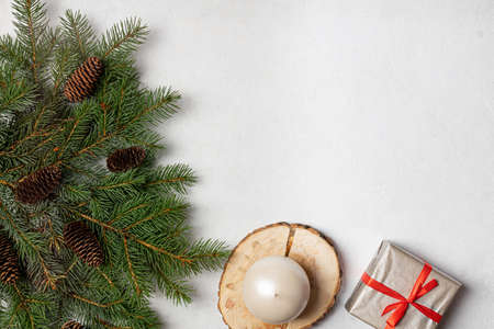 Natural Christmas gift box with pine tree and Christmas ornaments decoration on white snow wood background. Flat lay top view with copy space for your text.