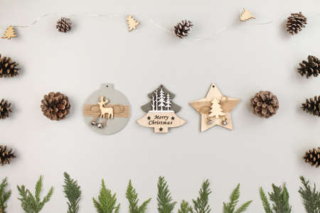 Wooden Christmas decorations, branches of thuja and pine cones on gray background, top view, flat lay, copy space for text.