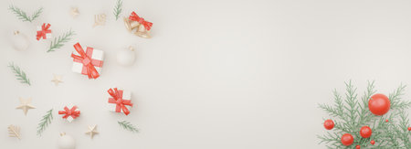 Christmas banner white theme, decorate with present box, pinecone, stocking, wreath, for christmas card, poster.