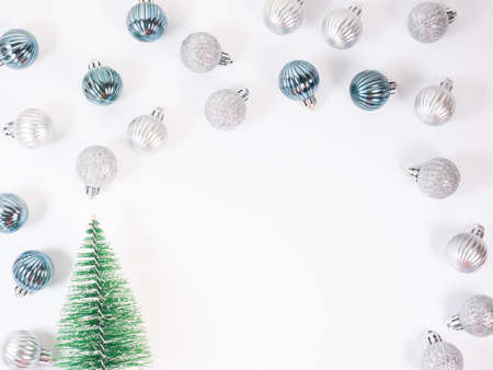 Christmas background. Glitter blue and silver Christmas balls around small fir tree toy on white background. Flat lay, top view.