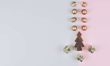 Christmas tree balls on a gay and pink background with a place for your text. Minimal holiday concept.