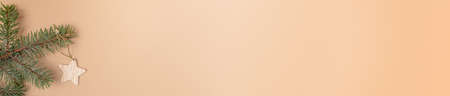 Christmas minimal wide banner with green fir tree twig and festive decoration - Xmas toy - wooden star on beige with copy space for text. Top view. Horizontal orientation.