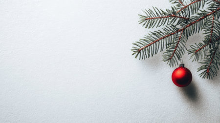 Elegant Christmas-themed greeting card layout featuring a minimalistic fir tree branch and red bauble on a snowy white background. Ideal for commercial design mockups.
