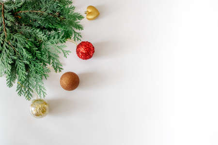 Christmas light background, fir branches with red baubles, pine cones and berries in the corner, beautiful frame and copy space for your text. White creative layout, flat lay, top view.