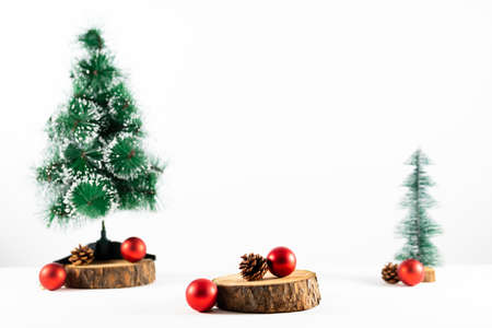 Minimal composition with stone podium and xmas tree on gray background. Copy space, place for text