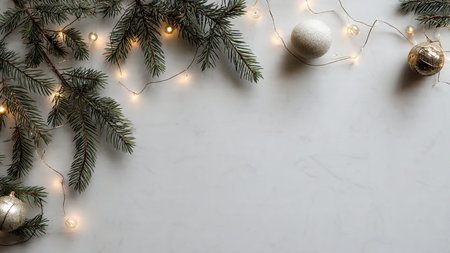 Premium stock image of a minimalist Christmas background with pine branches and fairy lights.