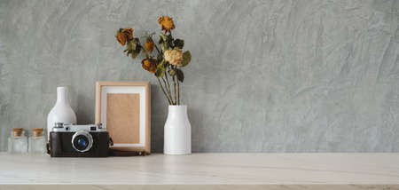 Cropped shot of simple worktable with camera, stationery, supplies and copy space on marble desk