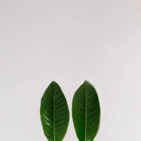 Bunny rabbit ears made of natural green leaves on bright background. Easter minimal concept. Flat lay.