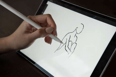 Female hand draws on a graphics tablet