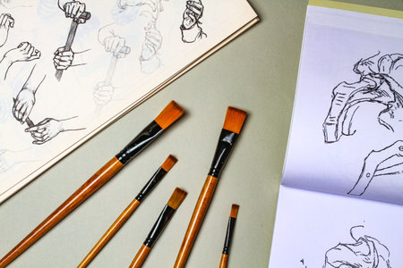 Flat lay of sheets for practicing drawing techniques with brushes. Gray background